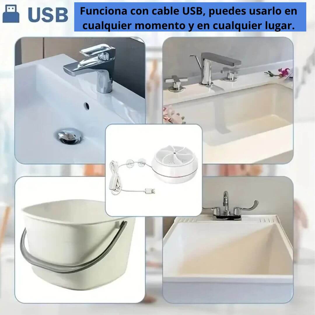 Lo pones en cualquier recipiente o balde. Lo conectas al USB. Y en 30 minutos, tus prendas están limpias.
